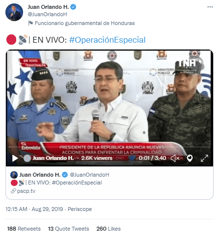 Twitter released a dataset containing a network of 3,104 accounts originating from Honduras after determining that the accounts were accessing Twitter from a single IP range. According to Twitter, ‘a staffer created the fake accounts’ on the behalf of the Honduras Government and the network amplified Honduran President Juan Orlando Hernández Alvarado (often referred to as JOH)—his account was the most retweeted by the network. Account creation and account activity in the network scaled up in 2019, and activity often focused on issues relating to JOH, who was facing a number of political challenges. On 19 October 2019, for example, his brother, Juan Antonio Hernández, was convicted of drug trafficking charges, which also implicated JOH and other family members. Some accounts in the network shared a video link to JOH’s live press conference concerning the allegations. There was also evidence of spam accounts being used by the network, as well as follow-for-follow tactics to expand reach. For example, the second most followed account (24,057 followers) appeared to be an account helping people grow their Twitter following (its profile description text was ‘follow me and I’ll follow you’). Facebook announced in 2019 that it had also removed accounts and pages that amplified positive content about the President. It found that ‘some of this activity was linked to individuals managing social media for the government of Honduras’.